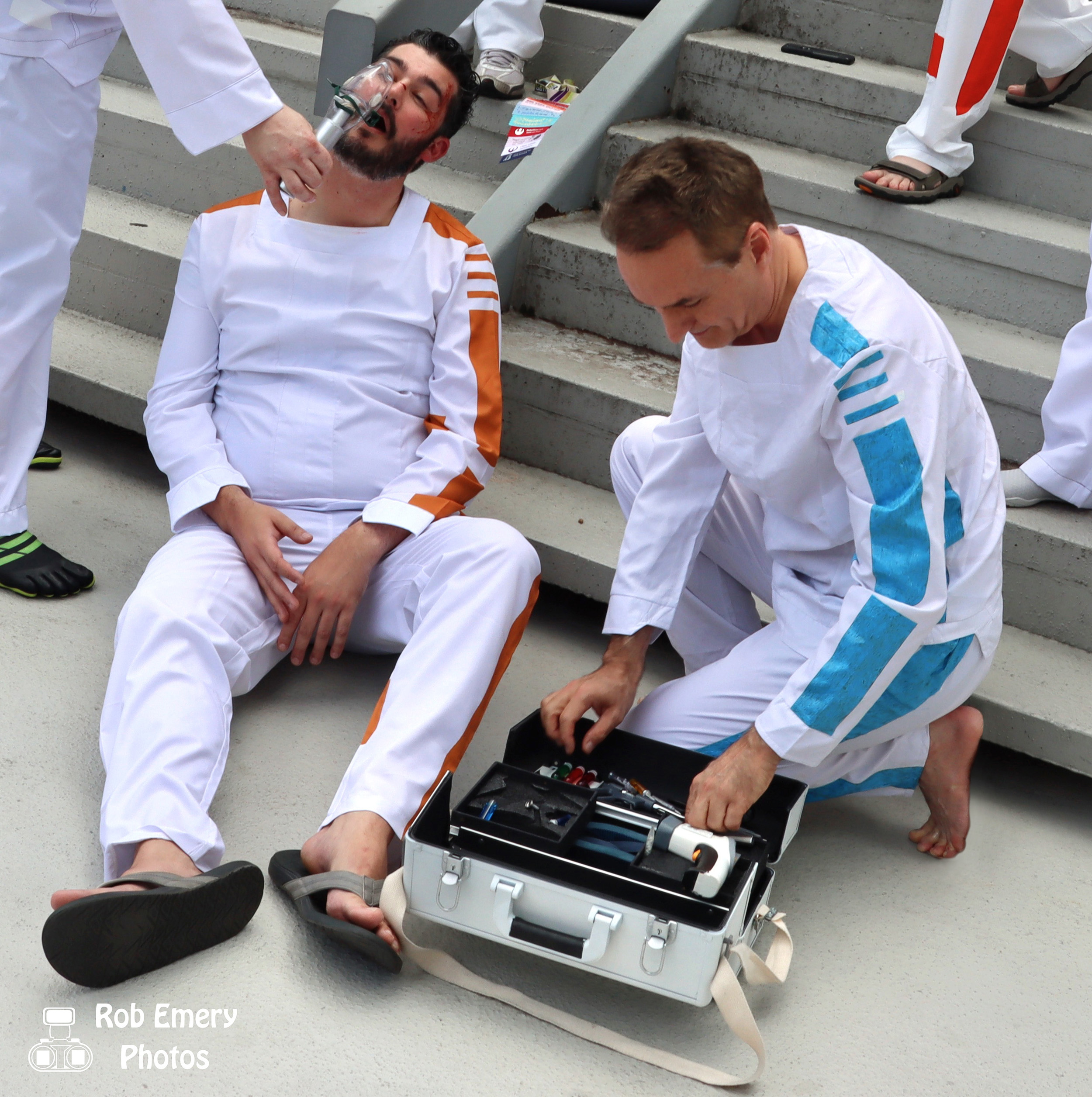 Dr. RhasivFor Dr. Rhasiv (Andor), I modified a commercial Narkina suit with blue fabric paint, and added a drawstring and hidden pockets. I made a medical case out of a plastic one I had and assorted greebles (3d printed and found), but later replaced it with a train makeup case, repainted and covered with laser cut and 3d printed greebles. For the tools, I acquired a dental injector and a thermal scanner and modified them to look like on the show. I also added some lethal injection and bactra capsules, as well as tweezers and scissors. |