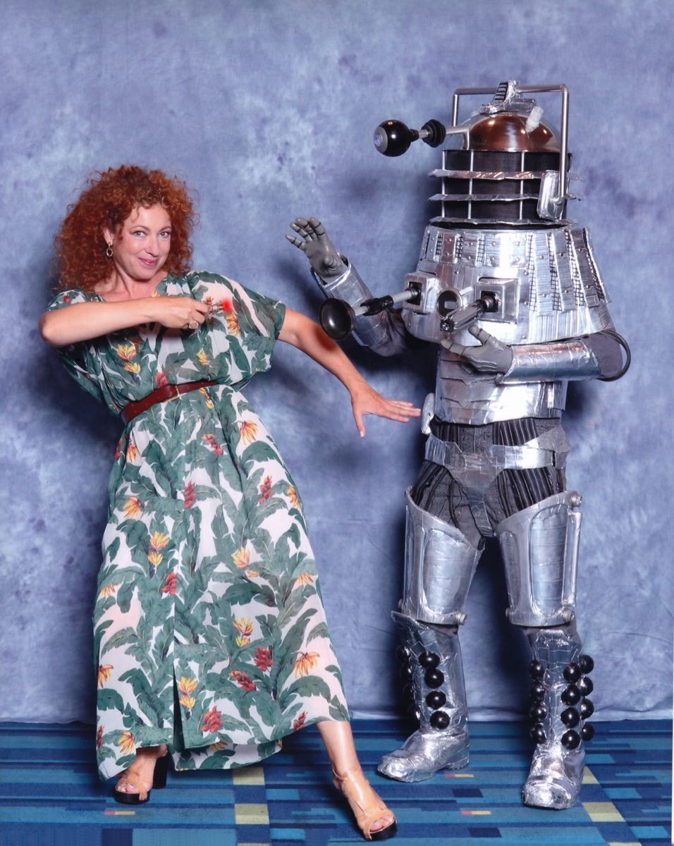 CybermanThe Cyberman costume is duct tape over bristol board, with foam for depth/shaping. A sound sensitive circuit was linked to LED's in the mouth and a keychain based voice circuit to deliver the "Delete" and "You will be upgraded" lines. Pic with J.Wood who made & was Mercy Hartigan.