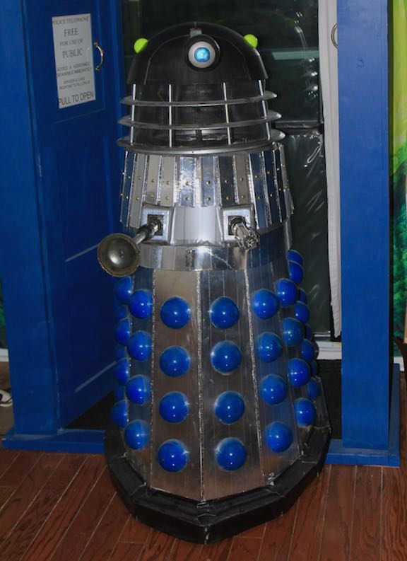 DalekI made a Dalek out of cardboard and duct tape. The head was a salad bowl, and the eye stalk was made from pvc tube and a spherical Coke bottle. It was later upgraded to a more screen accurate Emperor's Guard Dalek using 3d printing, mdf skirt, styrene body and aluminum tape over most of it.