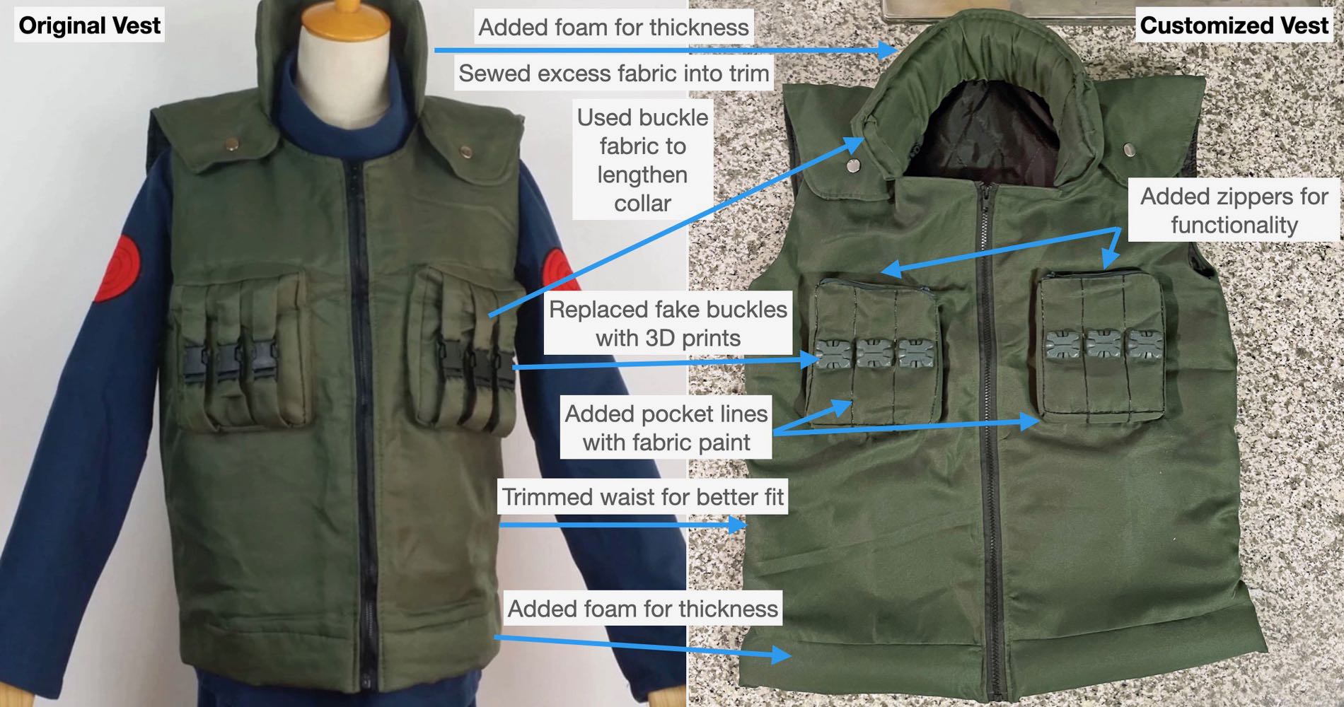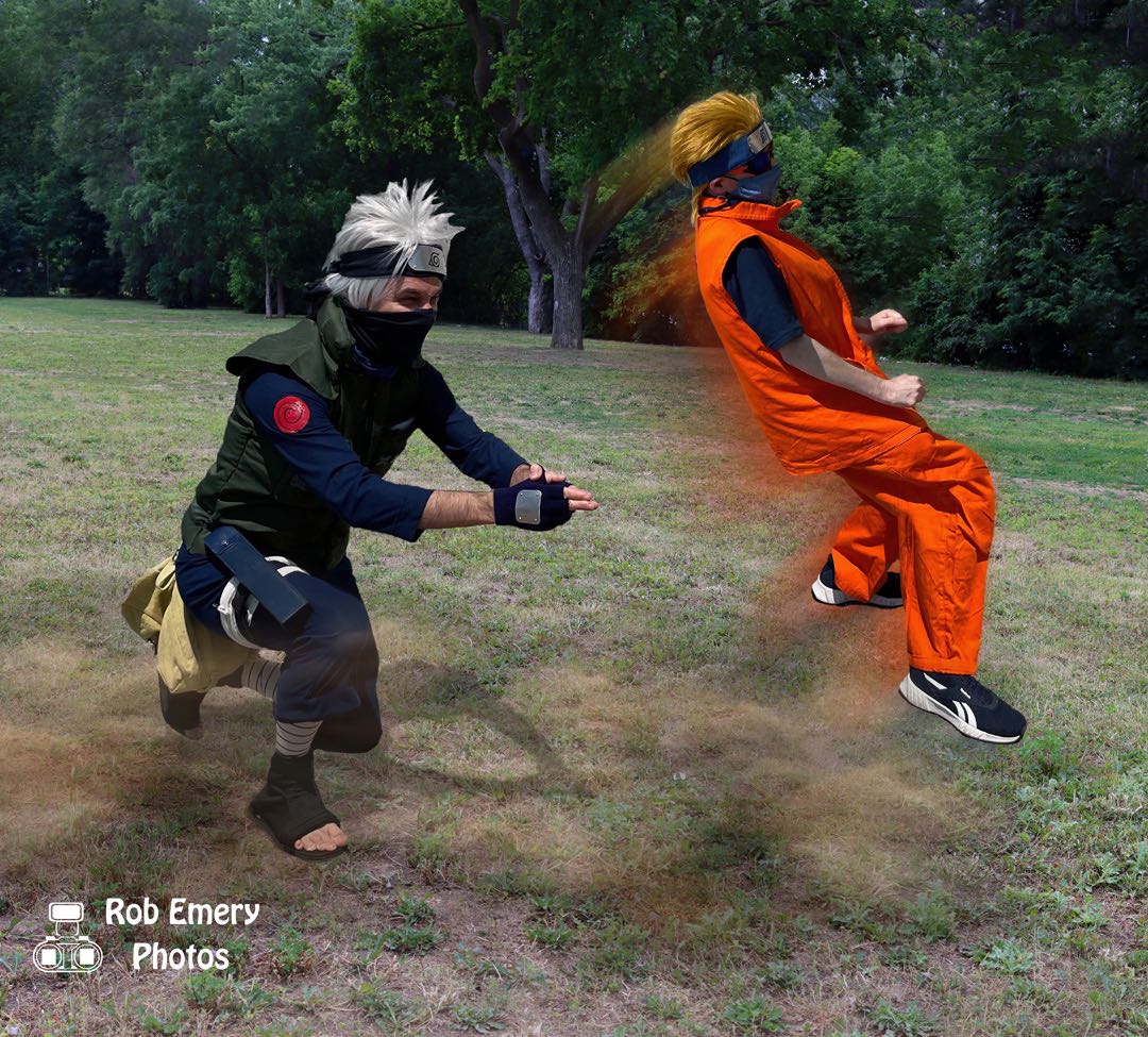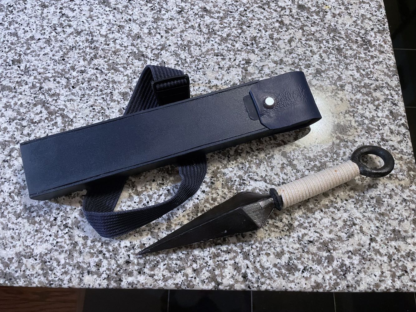 Kakashi Hatake (Sensei)For Kakashi, I made a headband by cutting up an old T-shirt, and fabric paint gluing it into shape. I cut, bent and glued an aluminum plate to it, and used fabric paint to make the Hidden Leaf village emblem. The rivets were silver painted gem stick-on's. I made a facemask with the rest of the shirt. The kunai was made by 3d printing a flexible ABS blade and gluing it to a solid 3d printed ABS handle wrapped with white cord. The holder was made out of sintra and I added a magnetic latch on the pleather lid, and an ABS buckle on the strap for adjustment and quick release. I also bought then modified the vest and sweatsuit, correcting the swirl logos by repainting them with fabric paint, thickening the neck piece using fabric removed from the front pocket buckles and foam, and adding in zippers (for functionality) and buckle decorations (for the correct look) to the front pockets. | |