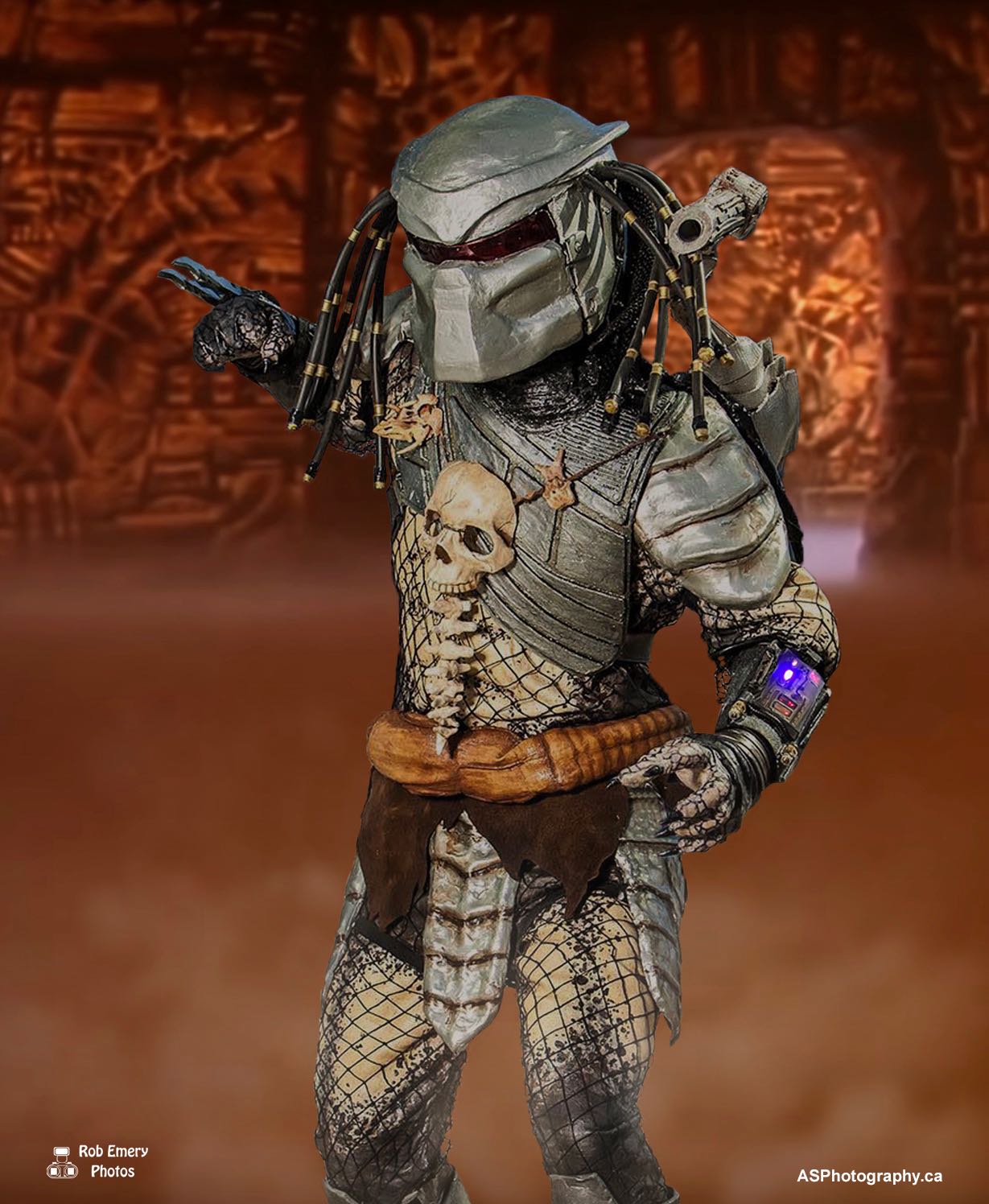 The Predator was made by painting in latex over a Mr.Incredible suit. The armor was sculpted out of air-dry foam and car mats. The helmet was sculpted out of (very heavy) plaster. To lighten it and some of the armor pieces, they were eventually replaced with Worlba molded pieces. The shoulder canon was made out of a toy and some foam. I incorporated a tracking and laser targeting system into it using servos and an arduino Uno. As the suit's pigmented latex paint didn't cure well enough in some places, this version was eventually replaced with a spandex suit, which is way more comfortable (breathes).