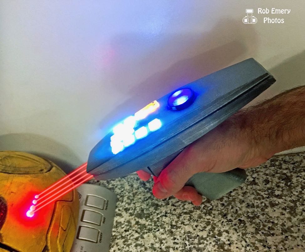 TOS TWOK & TNG - 1701-CI've always liked the look of the TWOK era uniform, so ended up buying a maroon jacket and adding trim to some black pants to make both McCoy and Richard Castillo uniforms with a removable (velcro) colour coded strip on the arm and removable (pin) strap for the shoulder. To go with it, I made an NCC1701-C era phaser using 3D printing for the body, and adding LEDs, switches, lasers and a sound card (simulated beam in pic, but impact dots are real). |