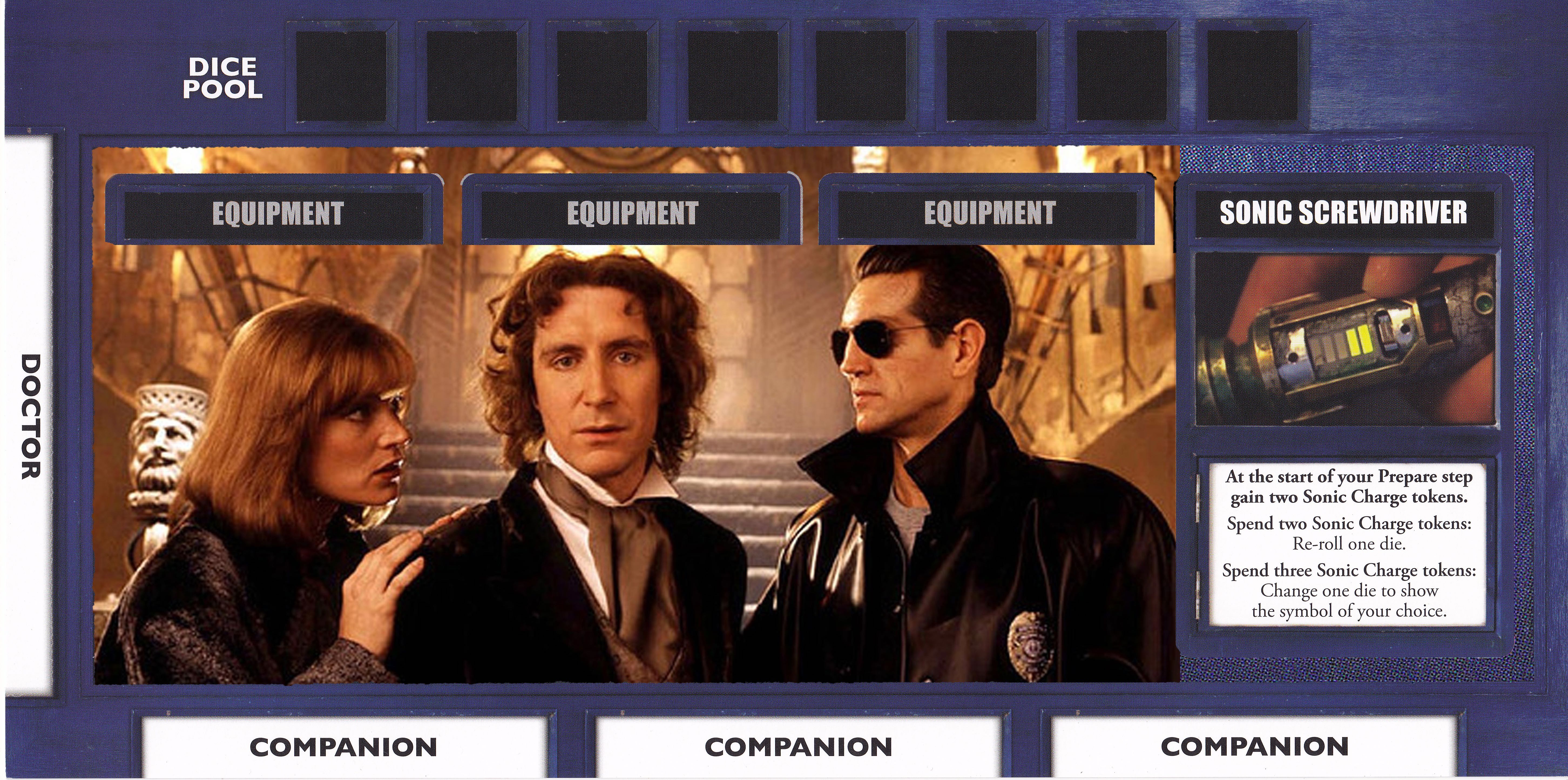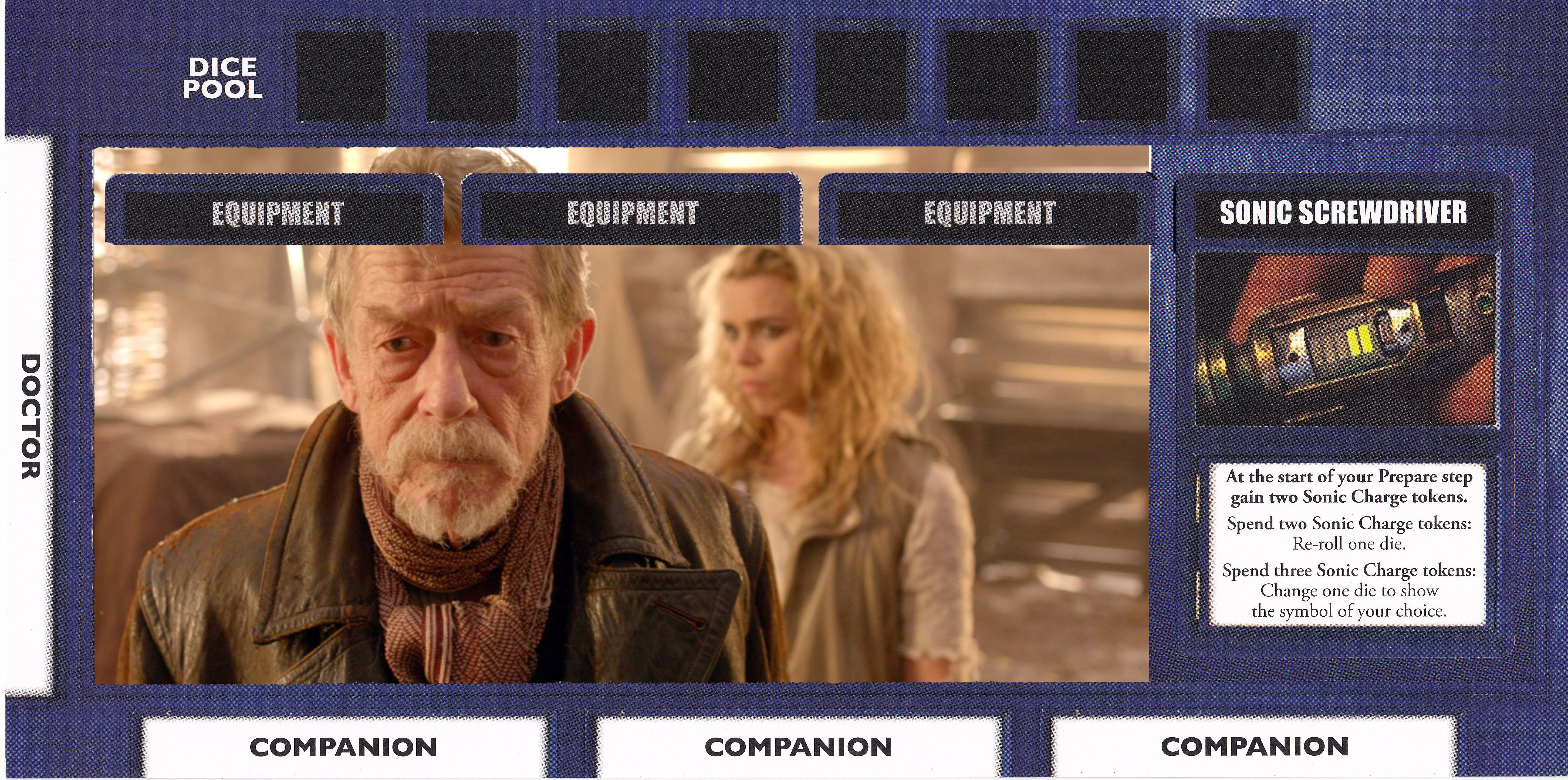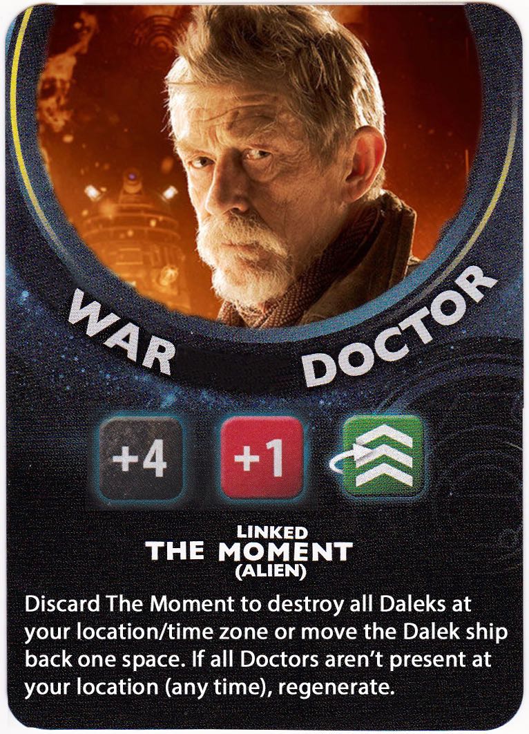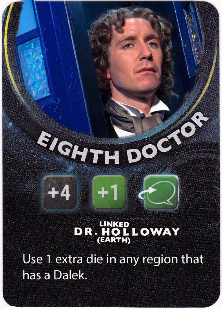 The "Doctor Who: Time Of The Daleks" game comes with only 4 of the doctors (1, 4, "11" (Smith) and "12" (Capaldi)), a 4 player limit, and was missing some cards: Captain Jack (who's in the instructions) and Tegan Jovanka (who's linked with included companions). So, I improved it by adding 3 doctors: Eighth Doctor / (McGann), War Doctor / (Hurt) and "10" / (Tennant) and their respective companions: Dr. Grace Holloway, The Moment and Donna Noble and the missing Captain Jack and Tegan Jovanka cards, and I decided to add a Jackson Lake and a Rose Tyler too. I made spares of the turn and dice cards for the extra players. For the "10" and "11" I had some minifigures I used for the game pieces, and 3D printed a War Doctor and an extra Tardis for each of the new doctors. I found the rules complex for a dice rolling game, so simplified the regeneration process and created a reference sheet with an even simpler version of the game, as well as the "beginner" and full version instructions. | |