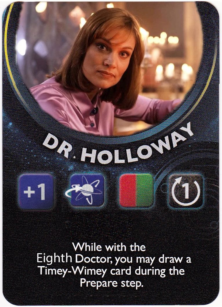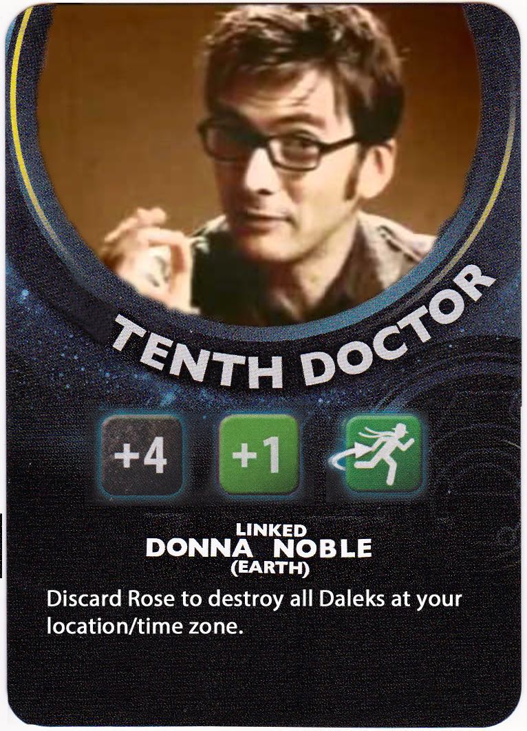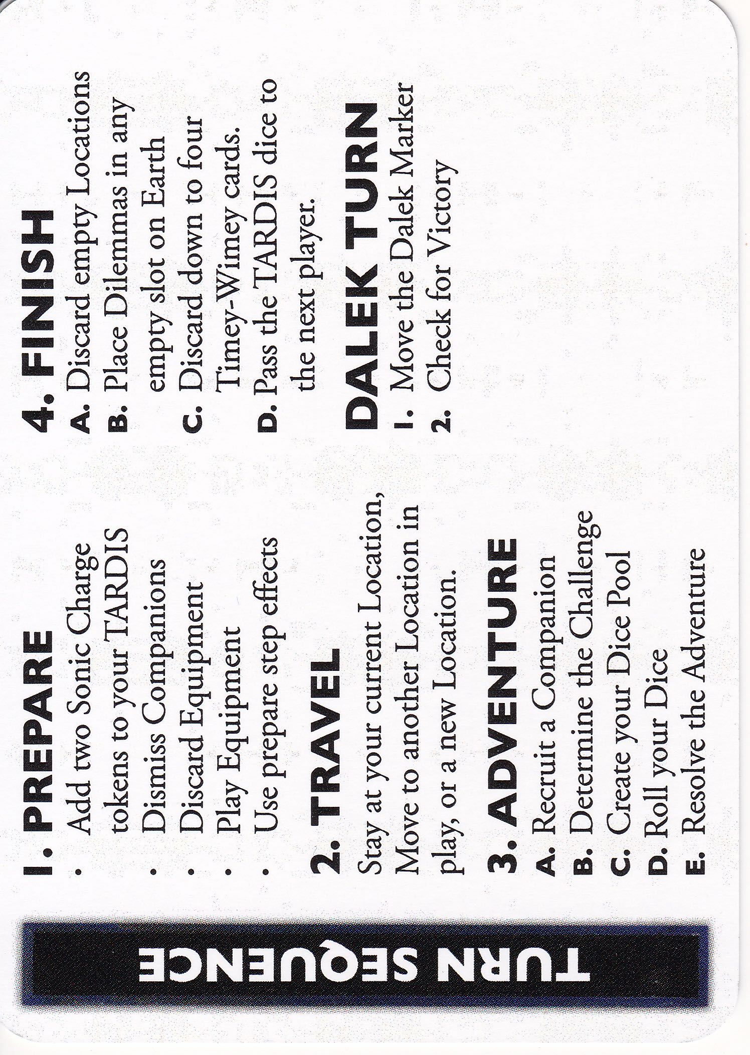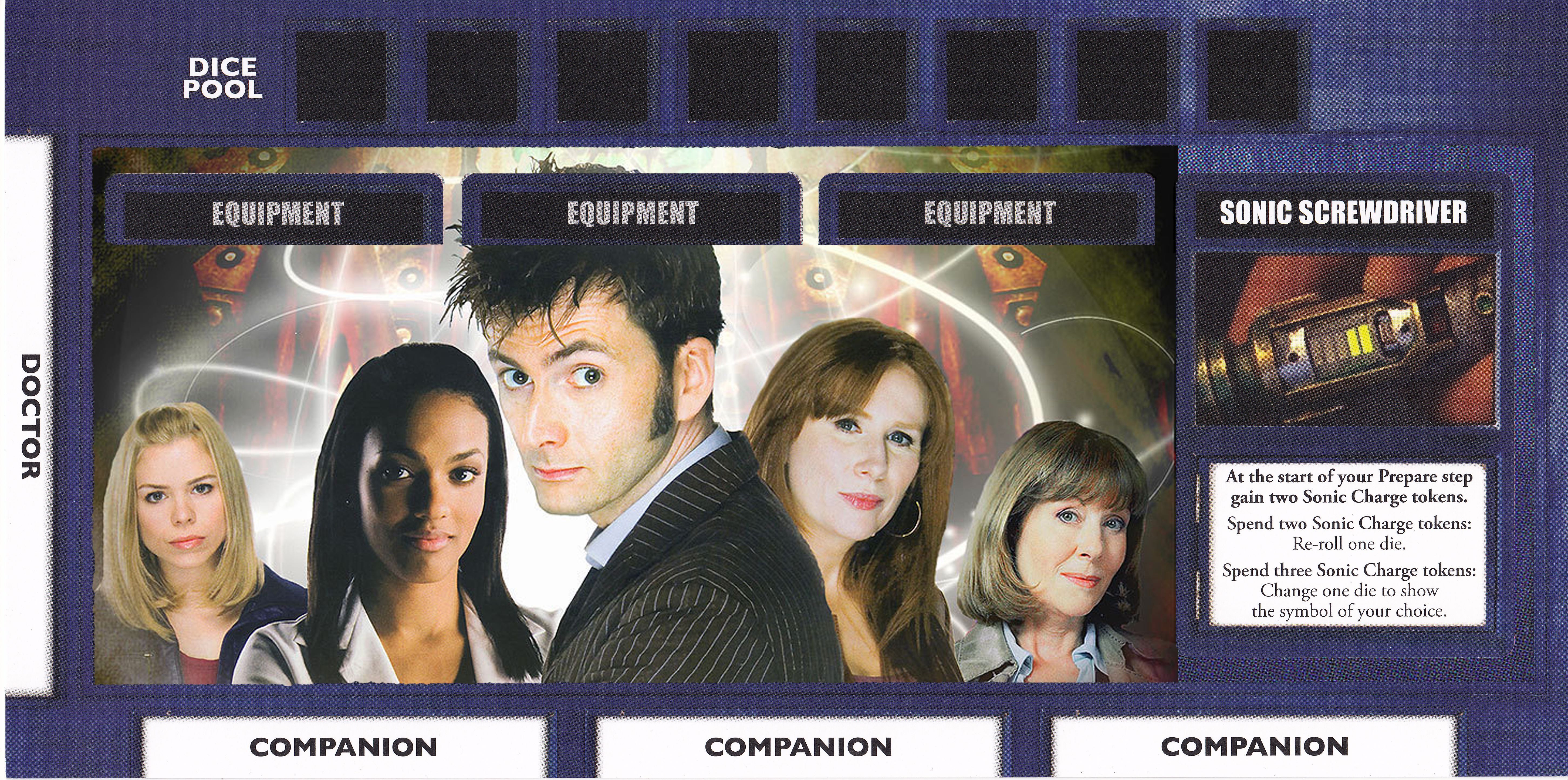 The "Doctor Who: Time Of The Daleks" game comes with only 4 of the doctors (1, 4, "11" (Smith) and "12" (Capaldi)), a 4 player limit, and was missing some cards: Captain Jack (who's in the instructions) and Tegan Jovanka (who's linked with included companions). So, I improved it by adding 3 doctors: Eighth Doctor / (McGann), War Doctor / (Hurt) and "10" / (Tennant) and their respective companions: Dr. Grace Holloway, The Moment and Donna Noble and the missing Captain Jack and Tegan Jovanka cards, and I decided to add a Jackson Lake and a Rose Tyler too. I made spares of the turn and dice cards for the extra players. For the "10" and "11" I had some minifigures I used for the game pieces, and 3D printed a War Doctor and an extra Tardis for each of the new doctors. I found the rules complex for a dice rolling game, so simplified the regeneration process and created a reference sheet with an even simpler version of the game, as well as the "beginner" and full version instructions. | |