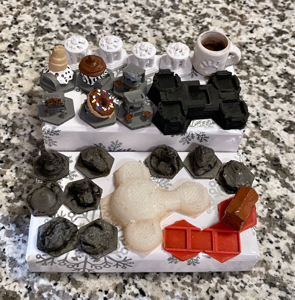 For a friend's Ark Nova game, I 3D printed and painted some pieces folks have uploaded to Thingiverse, including: white pavillions and a coffee break mug, grey rocks and kiosks, a black reptile house, a clear aviary and a red/brown petting zoo. The pavillions and petting zoo were modified a little for better printing and durability. | |