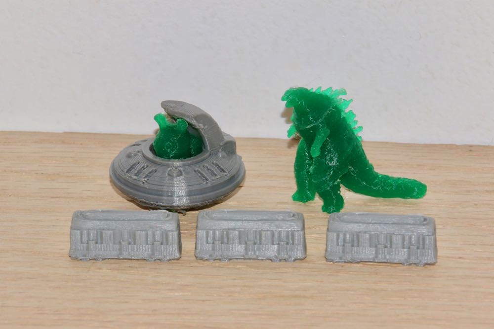 For Ticket To Ride, I 3D printed a 6th grey player and a Godzilla & Alien expansion. | |
