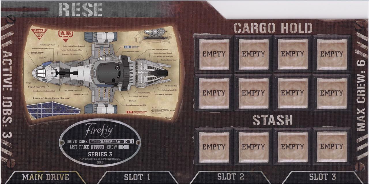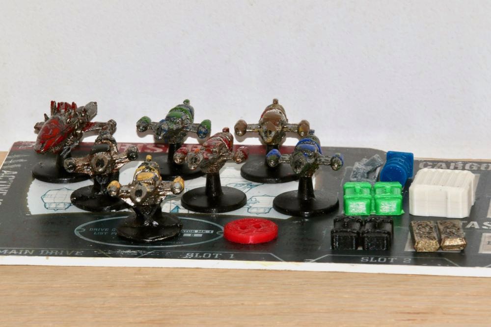 Firefly is limited to 4 players, so I added 2 more ships (molded and cast, but there are 3d print files out there too) and ship cards (printed and glued to a board) for them: Rese and Riser. For fun, I also 3D printed some items: Fuel, parts, passengers & cargo, unhappy crew (angry emoji), goals & warrants. To make it simpler to teach, I condensed the rules to a one page reference sheet. | |