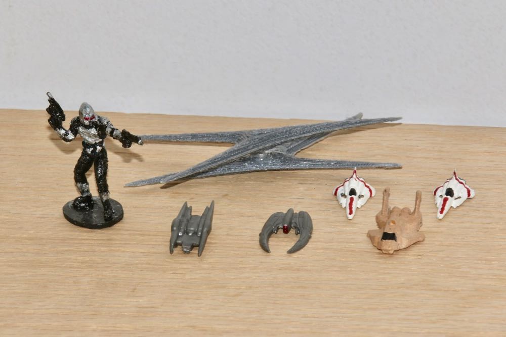 Battlestar Galactica allowed 6 players, which is a minimum I like, but it included more player cards so I upgraded it to handle up to 8 players. I experimented with new loyalty cards, but the extra complexity didn't help, so I just went with simple cards and a new loyalty chart. One thing I noticed is that players getting "you are not a cylon" cards didn't look at them long, whereas those receiving the cylon cards did (more to read) - giving away who's the cylon. To even that out, I added text to all the "You are not a cylon" cards so everyone had something to read and include a minimum 20sec read rule. The second phase cards are a different color and are always the same regardless of number of players so you have one less deck to setup at the start. I 3D printed new basestars and painted the vipers and raptors. | |