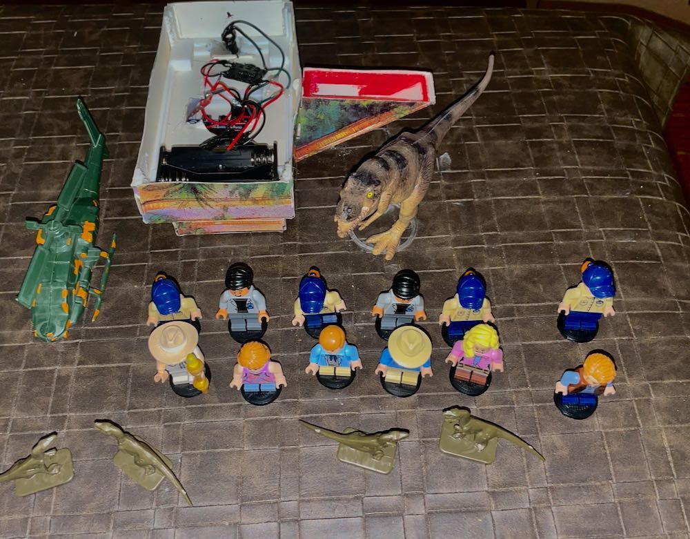 I got The Lost World Jurassic Park Game from a friend, and it had slight damage to the flimsy cardboard buildings, so I removed the faulty roofs, and reinforced the structures with 3D printed inserts. The people and chopper were originally just cardboard figures, and the T-Rex was not to scale with the raptors, so I replaced them all with new 3D versions. The people are now Lego minifigures, the chopper and T-rex are from the dollar store. I also added sound to the main building (to have the T-Rex roar any time the dinos eat a human), and to the heli-pad (to have Arnold Schwarzenegger say, "Get to the choppa!" any time a human makes it to the heli-pad. | |