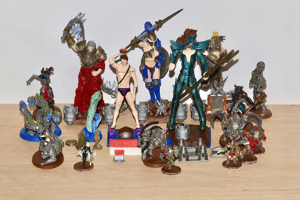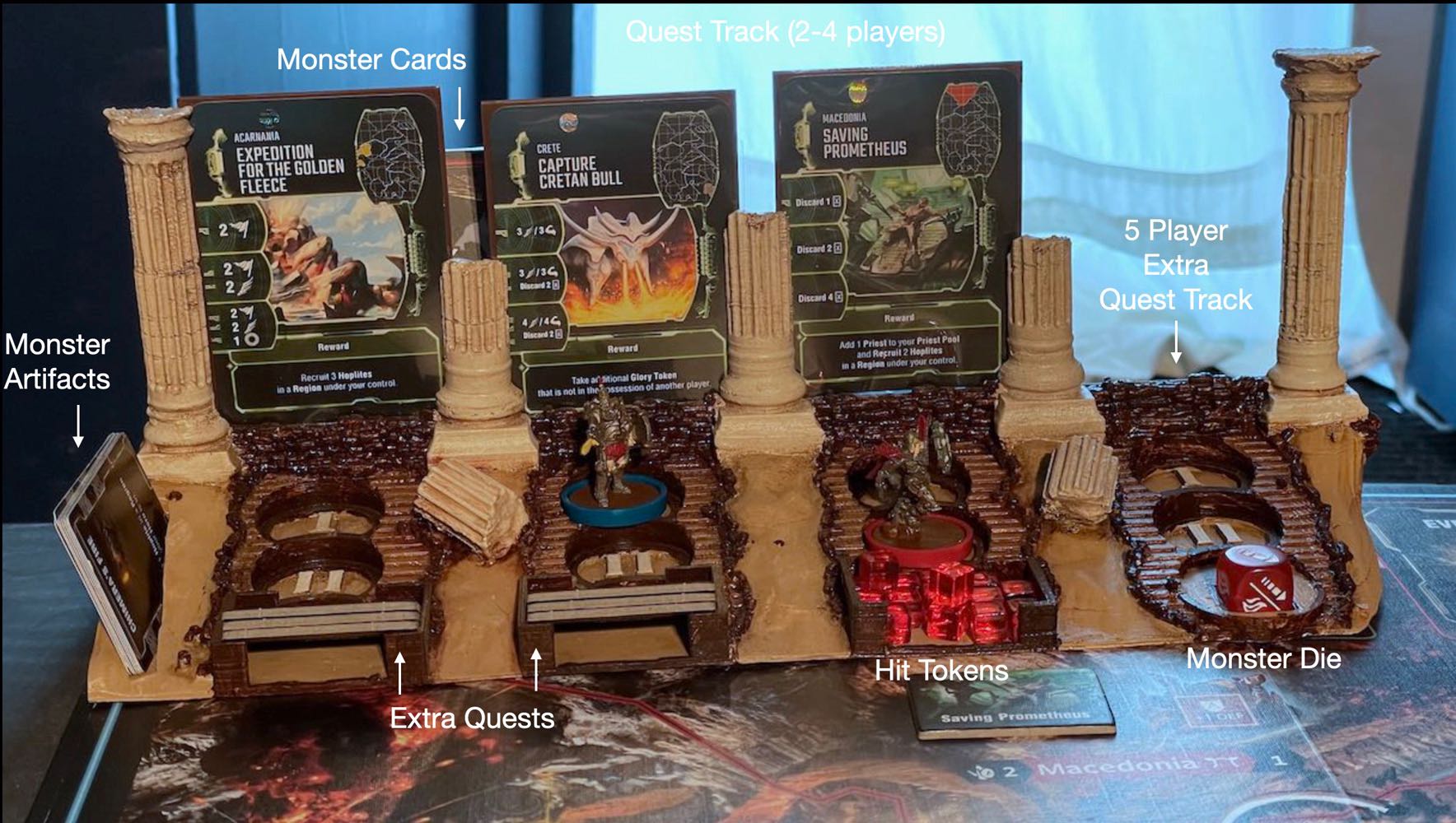 The Lords Of Hellas game I bought only allows 4 players, but came with a bonus hero, Odysseus, so I used that as a starting point for making a 5th player expansion using 3d print pieces from Pocket-Tactics and Animal Crossing 3D print sets. The board also came with 4 spots for monuments but only 3 included so I made a 4th for that out of a Poseidon model and then 5th for the expansion out of a Colossus model. I also used some 3D print pieces to replace the cardboard temples & Delphi, and add 3D Sparta & regular cities, though these are available now: Delphi & Terrain Expansion. I also modified JosoNL's Quest Mountain to be compatible with my 5th player expansion (sleeved cards due to extra monster & extra quest slot). Since the game doesn't need the 3rd quest slot (heroes return to their region of origin), my Quest Mountain uses that space for storage of extra quests, hit dice, and I and added a few more slots to hold monster cards and artifacts. | |