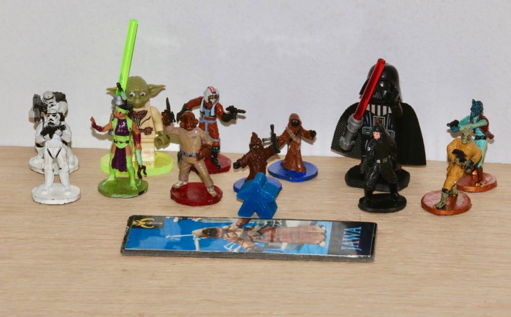 Star Wars Carcassone is limited to 5 players, or 2 teams of 2 and 1 team of 1 - that seemed odd, so I added a 6th group, Jawas, to make it 3 teams of 2 or 6 players. The Jawas join the bounty hunter group (they are the bounty hunters of droids, and both groups work for anyone if the money is good). The extra blue meeples were 3D printed. I also replaced the larger meeples with mini figures, painted their bases to match their faction and gave each team their own coloured dice. | |