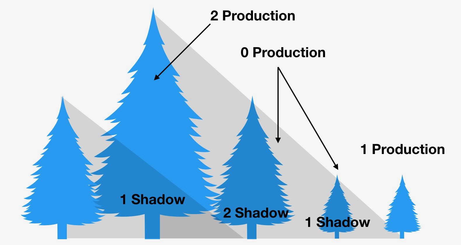 The Photosynthesis board game only allows 4 players, but I created an extra player mat and tree (Palm) set for a 5th player. The rule of blocking all production from a tree when it is only partly shaded by its neighbour seems odd so I modified it so that production is only slowed down by as much as a tree is shadowed at a 45 degree slant: Eg. A size 3 tree casts a size 2 shadow 1 space away, a size 1 shadow 2 spaces away and no shadow beyond that. So, a size 2 tree in a size 1 shadow only produces 1 photosynthesis. More Examples | |