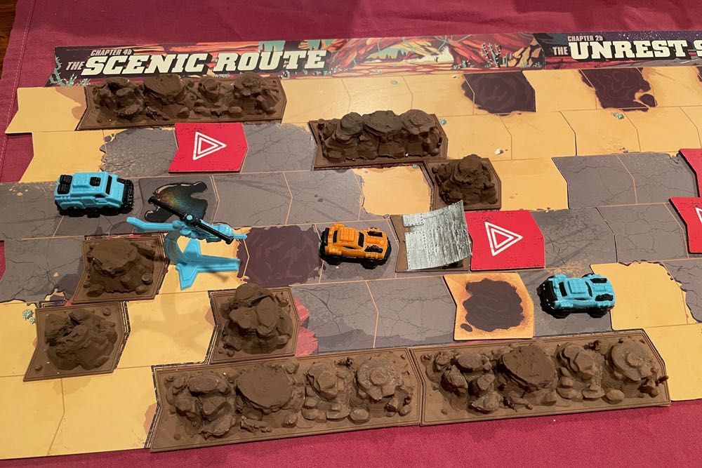 For Thunder Road, I 3D printed the terrain tiles, ramps, and an extra player - for use with a staggered launch (1 vehicle in the 1st round, two in the second, 3 in the third) | |
